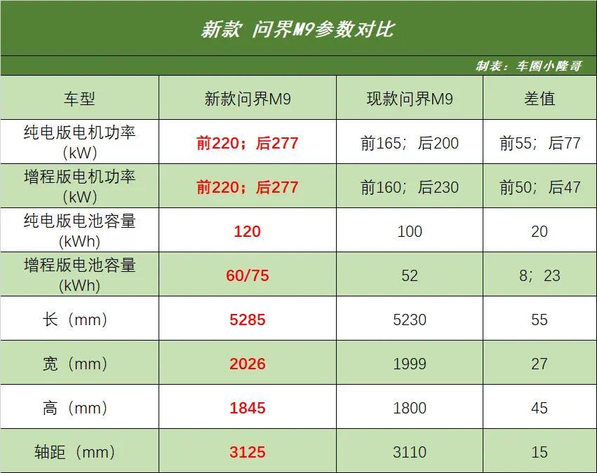 能源方面,人人不错参考前边作念的参数比对表,新款问界M9在电机功率上有很大的提高,纯电版和增程版前后电机功率均为220/277千瓦。