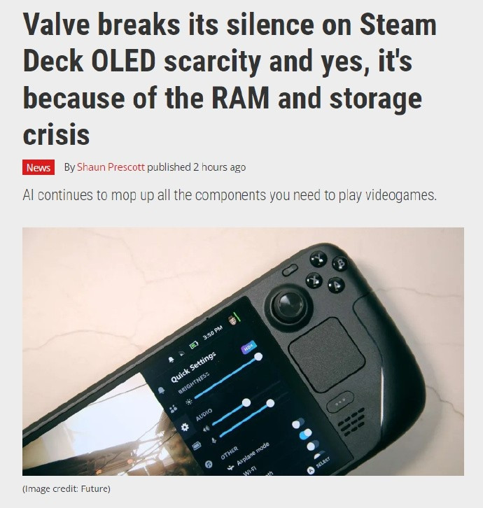直播吧2月17日讯据外媒报谈,近日Valve官方在其SteamDeck商店页面上更新了一段阐扬,阐发“由于内存和存储枯竭,SteamDeckOLED在某些地区可能会间歇性缺货”。