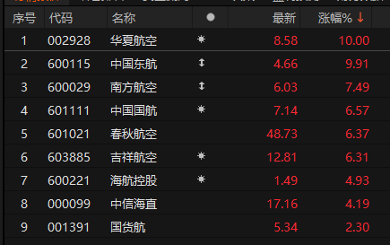 海外油价大跌,刺激A股阛阓航空股集体走强。其中,中原航空、中国东航涨停,南边航空涨超7%,中国国航涨超6%,春秋航空、祥瑞航空等均大涨。