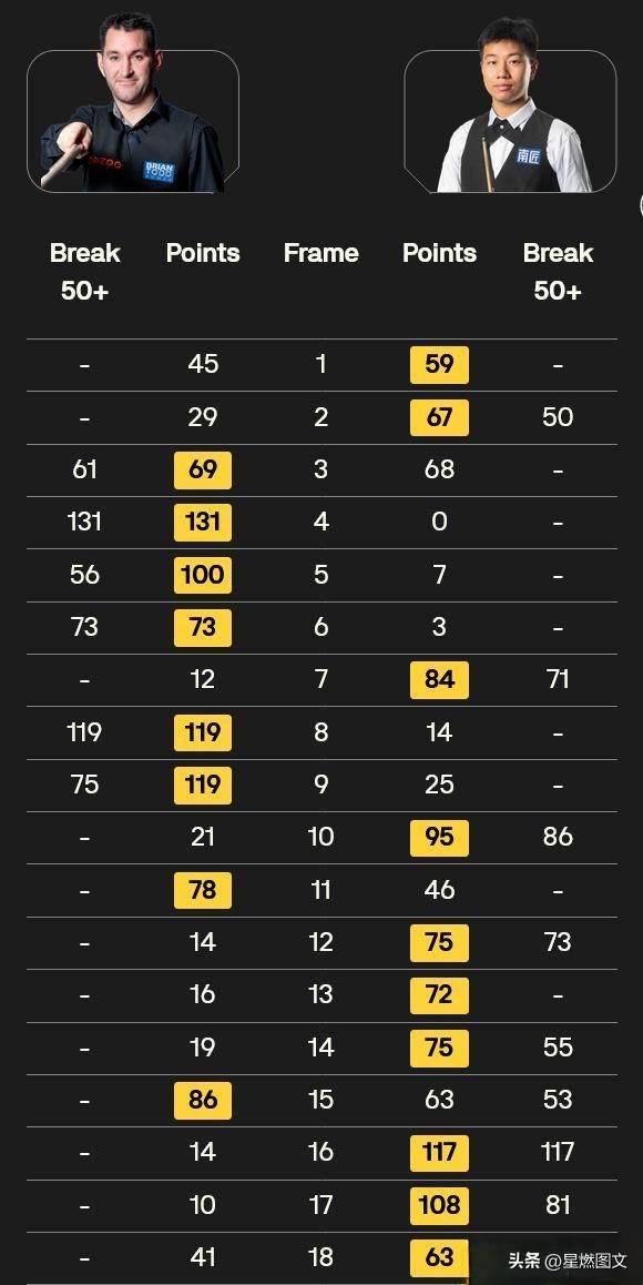 除了高阳的惊喜除外,周跃龙的阐扬雷同可圈可点。他以10-3轻取罗比·麦奎根,尤其值得称谈的是,在2-3过期的情况下,他果然连下八局,以一波“八连鞭”带走得手,展现出雄壮的轨则力和褂讪性,收效晋级决胜轮,下轮将挑战迈克尔·霍尔特。而龙泽煌雷同阐扬出色,以10-2横扫奎因,全场轰出一杆破百和七杆50 ,手感火热,状况正佳。更令东谈主期待的是,他的第三轮敌手是同族,这意味着中国军团至少锁定了一个决胜轮的席位。