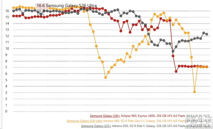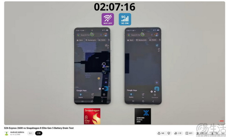 而在Android Addicts的续航测试里,搭载Exynos 2600的Galaxy S26 Ultra续航时分比同成就的第五代骁龙8至尊版机型,少了接近30%。