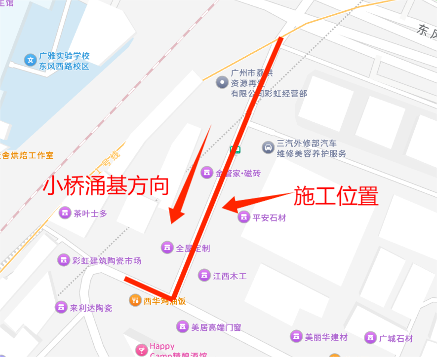 西华路至小桥涌基谈路:德坭立交桥下至彩虹建筑陶瓷阛阓5米宽生动车谈,剩余1车谈3.5米宽供车辆挨次通行。