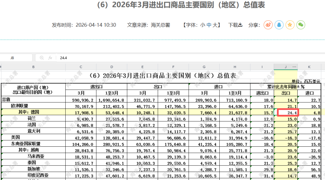 此外,一季度累计出口到德国的增幅达到24.4%。