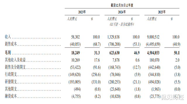 起初从事迹层面来看,招股书数据高慢,2023年至2025年,念念格新能营收诀别为0.58亿元、13.30亿元、90.01亿元,2025年营收同比增长约576.8%;净利润诀别为-3.73亿元、0.84亿元、29.19亿元,2025年净利润同比增长约3381%;毛利率也从31.3%大幅擢升至50.1%,这么的高毛利率水平在大师储能市集会较为荒原。