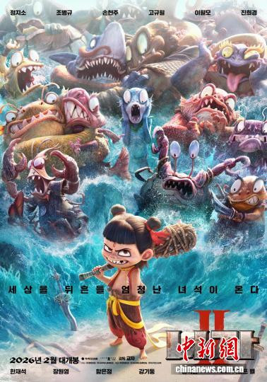 2月2日,中国动画电影《哪吒2》在首尔举行媒体及发行试映会。图为《哪吒2》韩语版海报。ContentsZone供图