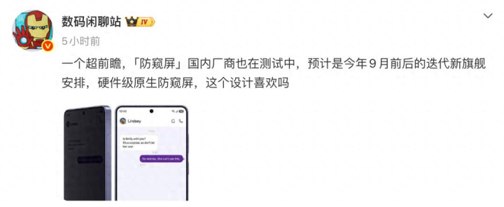 对此,博主@数码谈天站 的一份爆料中提到,“一个超前瞻,「防窥屏」国内厂商也在测试中,预测是本年9月前后的迭代新旗舰安排,硬件级原生防窥屏,这个蓄意可爱吗”。