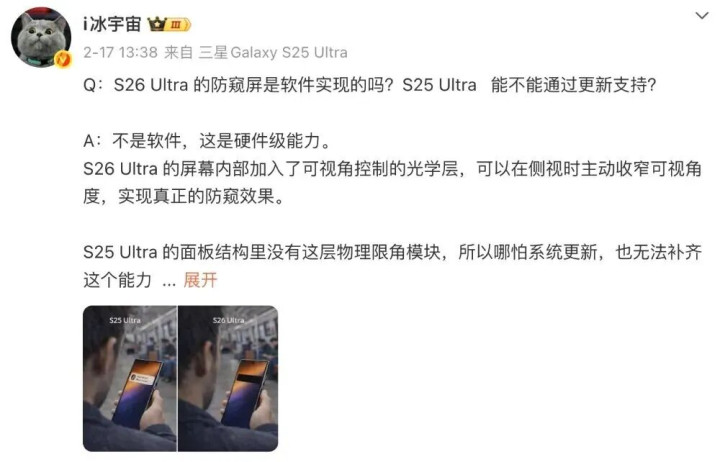 按照这位博主的说法,三星的这项防窥屏功能是硬件级才调。Galaxy S26 Ultra 的屏幕里面加入了可视角戒指的光学层,不错在侧视时主动收窄可视角度,收场确切的防窥甩掉。S25 Ultra 的面板结构里莫得这层物理限角模块,是以哪怕系统更新,也无法补都这个才调。