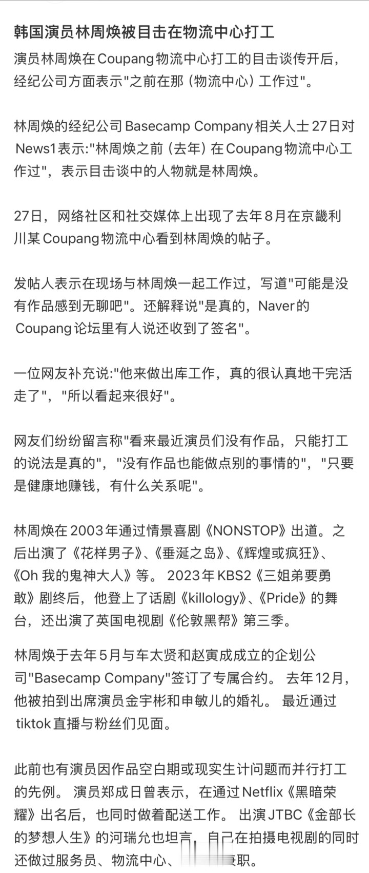 林周焕所属经纪公司Basecamp Company于2026年2月27日公开回答,承认林周焕在2025年演艺职责空窗期曾于韩国电商平台Coupang的物流中心担任货品搬运工,主要负责出库功课。