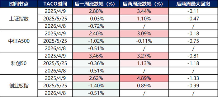 而在历次TACO之后,上证指数、中证A500、科创50、创业板指等宽基指数均推崇得当!其中不管是从事件的影响深度照旧对我国的影响进程来看,最具备可比性的是旧年4月的TACO事件。