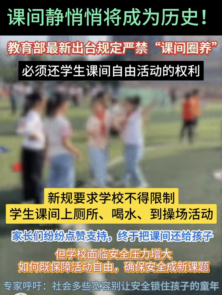 这次新规的出台,并非单纯放宽校园管束门径,而是基于学生身心健康发展的科学考量。在素养部门的官方解读中,课间休息是学生转移学习气象、保护视力、促进肢体行径的进军形状,合理的课间行径,不仅能缓解课堂学习的疲倦,还能助力学生育成健康的生计民风,耕作肉体修养,这亦然新规落地的中枢初志。