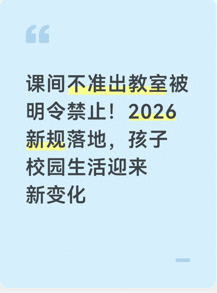 课间不准出教室被明令阻扰,不仅是校园管束的一次优化,更是对学生身心健康的有劲看管。2026年新规的全面落地,让课间特殊钟追溯本真,让学生领有了更解放、更健康的校园生计。