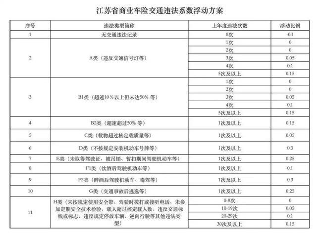 江苏关于交通积恶费率的浮动有揣度打算也十分细,将交通积恶活动分了10类;其中A类为违背交通讯号灯,跨越3次,费率浮动为5%-15%。B类是超速,C类是超载,往下还有酒驾和交通事故后逃跑。